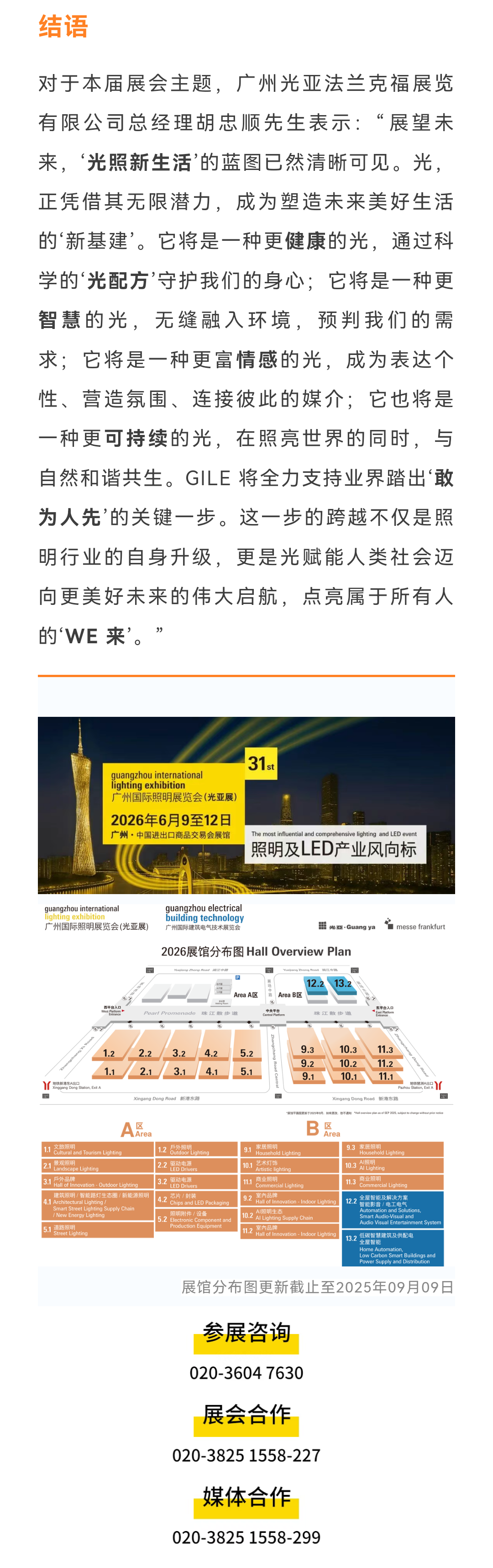 从第 30 届“跨越一步的精神”到第 31 届“敢创敢为的实践”,全球照明产业的风向标-广州国际照明展览会(GILE)定于2026年6月9至12日在广州中国进出口商品交易会展馆A及B区盛大举行。GILE会以“敢”字为核心,确立“光照生活新时代-敢创WE来,敢为超越”主题,携手全球照明人共同推动产业三重升级:在技术层面,从单品研发到系统解决方案,整合 A1、5G与可再生能源;在价值层面,从功能满足升华至情感共鸣,强调光对身心健康与社交互动的积极影响;在产业层面,以新质制造为方向,构建'科技+艺术+人文”的创新生态,开启光照生活新时代。